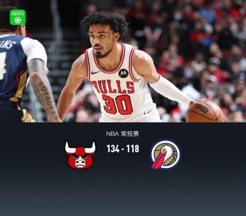 第四節(jié),前半節(jié)雙方拉鋸,維持10分上下分差,節(jié)中公牛許爾特、道蘇斯接連得分領(lǐng)先17分,鵜鶘一波7-0追至10分,但緊跟公牛又是一波7-0再度拉大分差,鵜鶘再無(wú)力反撲,最終公牛134-118戰(zhàn)勝鵜鶘。